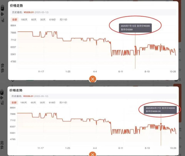 其实,这已是今年内第二次调价:618 活动结束后,该机型曾一度取消国补、价格从 7 月13日的 6399 元涨至 9 月17日的 6699 元。可是到了 10 月 25 日,重新支持国补后,销量瞬间暴涨。可见“补贴+绝版”二合一,效果杠杠的。