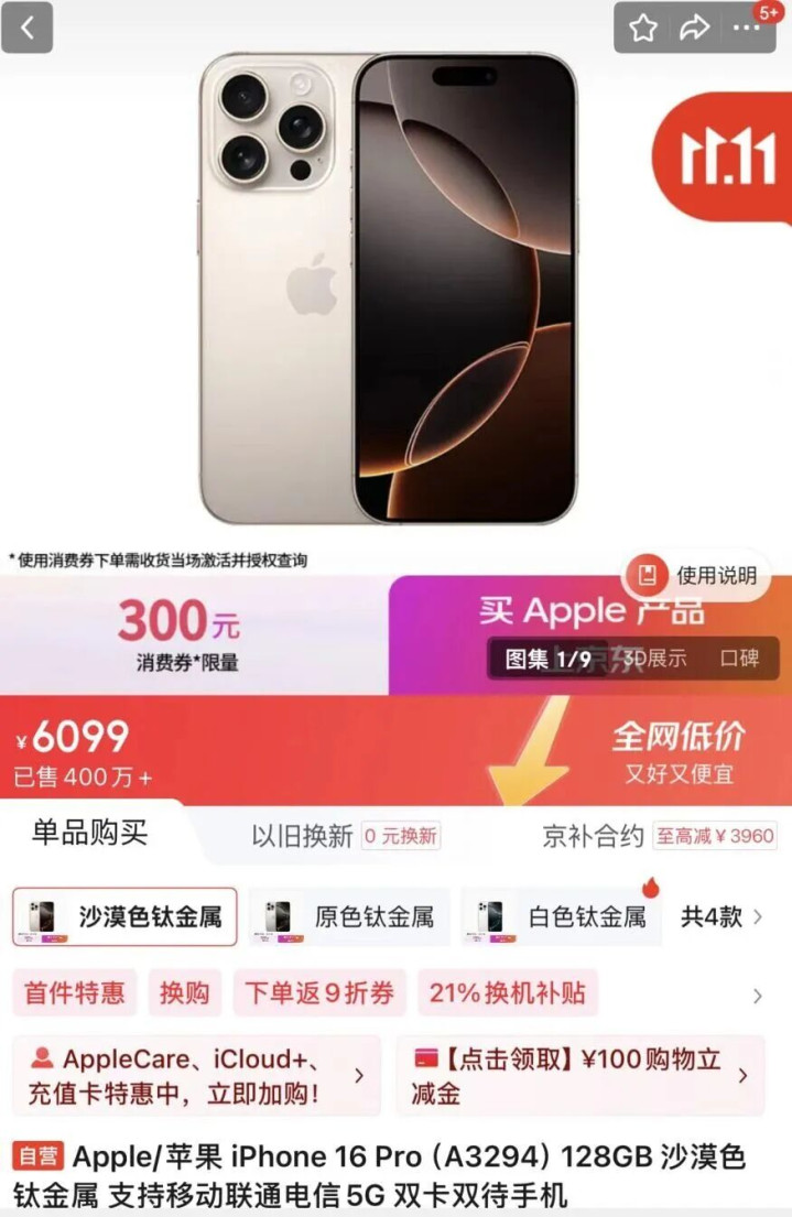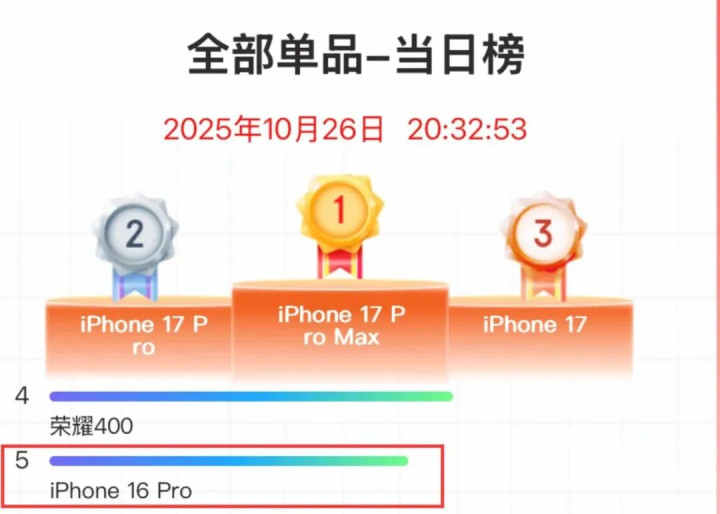 到了十月下旬,猫东等平台数据显示,iPhone16Pro 128 G 版的销量开始起飞:截至10 月 26 日晚,某东手机销量榜该机型居然冲到了第五位,均价报 5499 元。